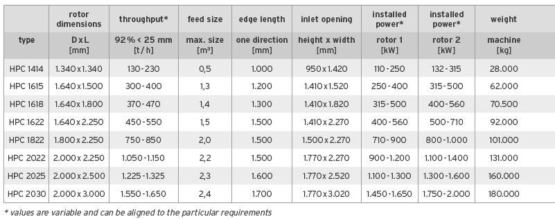 Two-stage crushing within a single housing by two co-rotating rotors operating in tandem. The 1st rotor crushes the feed rocks of up to 3 m³ in volume; the 2nd rotor, which runs at a higher speed, reduces the feed material to product size. The HPC crusher has 2 or 3 impact aprons and a grinding path; the settings are controlled either by spindles and/or hydraulics, therefore allowing for optimum control of the end product granulometry. The grinding path restricts the amount of oversize.