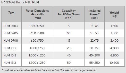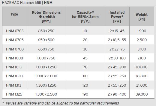Hammer mills of the type HUM and HNM are employed for the fine crushing and/or mill drying of medium-hard to soft materials. Examples: Anhydrite, quicklime, lignite, dolomite, electronic scrap, gypsum, glass, potash, limestone, china-clay, diatomite, chalk, phosphates, salts, French chalk and clay.