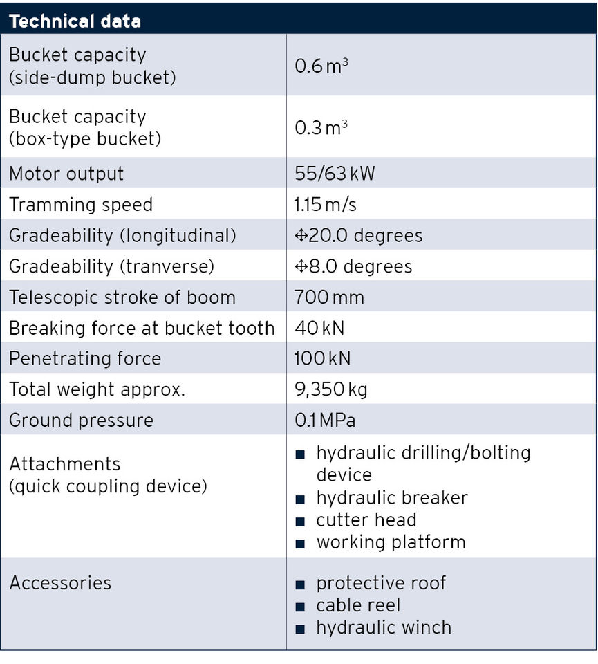 The Multi-Functional Loader HMF 600 is the universal multipurpose loader for mining. Next to different buckets, with volumes of 0.3 m3 and 0.6 m3, there are a various of other tools and attachments for the HMF 600 available. Rapid attachment of various tools and use of the HMF 600 for loading, dinting, blast hole drilling, bolting and further applications is achieved by an innovative quick coupling device.